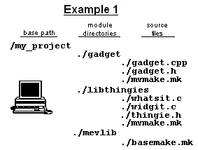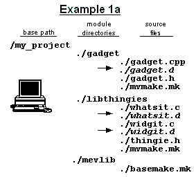 In Example 1, ./gadget is the current directory. The command "gnumake -f mvmake.mk" starts gnumake with gadget/mvmake.mk as the first input file. This initial mvmake.mk sets a variable ($M/MODULES_NEEDED) with the name of the modules it needs for compiling/linking. In this example, gadget/mvmake.mk needs the libthingies module so it contains the line: