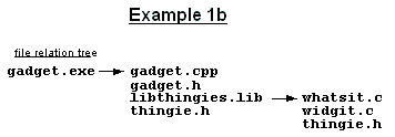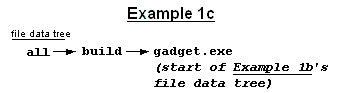 Example 1d shows how "all" and "build" fit into the example file data tree from Example 1c. They fit before gadget.exe. gnumake will attempt to see if "all" was up to date. In comparing it to "build", it discovers that it must test if gadget.exe is up to date before it can evaluate "build". The process continues recursively as it must now test the prerequisites of gadget.exe and each prerequisite's prerequisite, etc. Once the recursion completes, along with any builds necessary to get targets up to date with prerequisites, gadget.exe is up to date. At this point, gnumake marks the "all" and "build" file names as up to date by default since they have no commands as part of their rule.